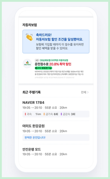 여기가 포인트! 운전점수를 잘 받으면 DB손해보험과 연계된 ‘네이버 지도 안전운전 할인특약’을 이용할 수 있습니다!