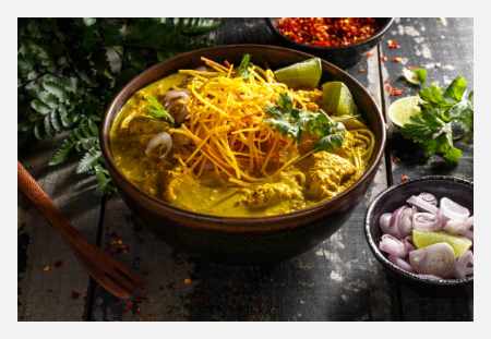 치앙마이 지방에서 온 카오 소이는 코코넛 밀크와 커리를 베이스로 한 국수 요리입니다. 주로 소고기나 닭고기와 함께 제공되며, 깊고 풍부한 맛이 특징입니다.